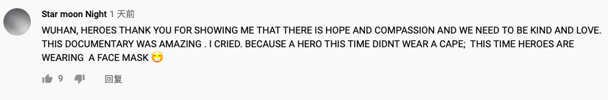 大量海外网友在观影后留言,对在武汉的医护人员表达了敬意,并为中国、为武汉、为病患祈福加油。YouTube海外网友Star moon Night表示,“纪录片太棒了,我看哭了。这次,英雄并没有穿着披风,而是戴着口罩。”
