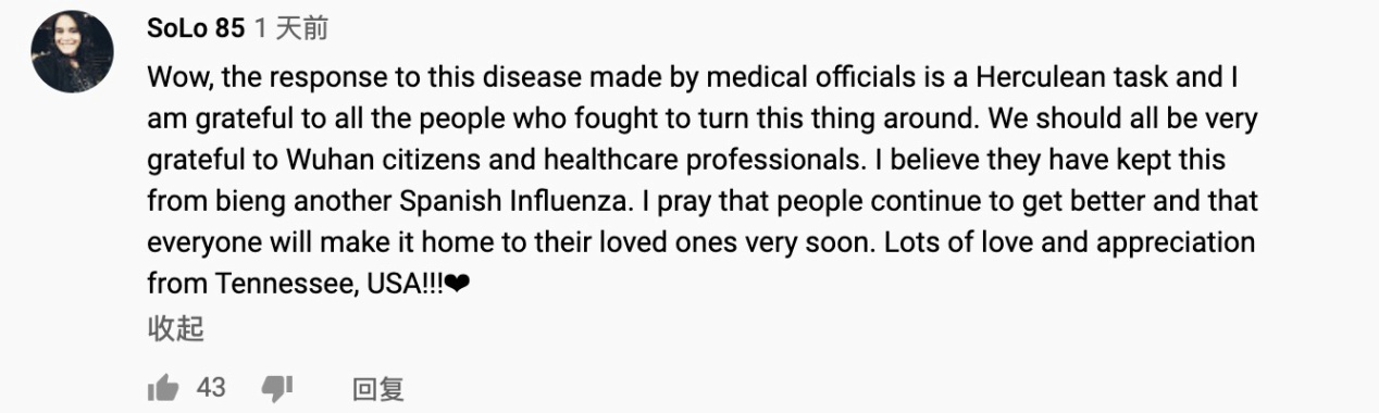 英国网友Bernadine Sarah W评论:“感谢这部纪录片,它为我们提供了抗击疫情的宝贵经验。非常感谢武汉人民用他们的献身精神阻止了病毒进一步传播。我们应该向他们学习。感谢武汉人民。”