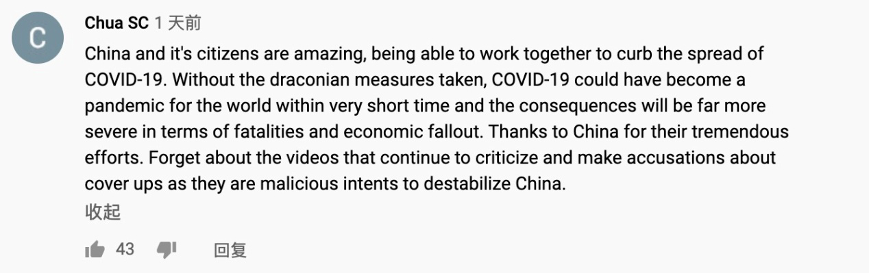 片中,中国政府迅速有效的行动,给一些海外网友留下了深刻的印象。YouTube海外网友Chua SC称赞道,“中国和中国人民真的很棒,能够团结起来防控疫情。如果不采取严厉的措施,新冠肺炎可能在很短的时间内成为世界性流行病,死亡人数和经济损失会更加严重。”
