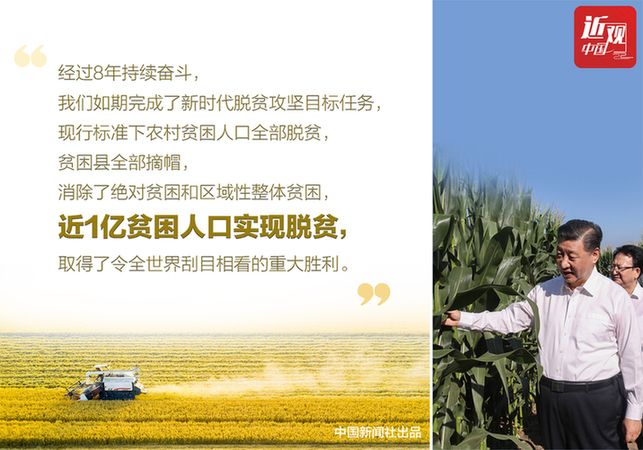 过去8年,为实现目标,中国采取了许多具有原创性、独特性的重大举措,组织实施了人类历史上规模最大、力度最强的脱贫攻坚战。经过8年持续奋斗,中国如期完成了新时代脱贫攻坚目标任务,现行标准下农村贫困人口全部脱贫,贫困县全部摘帽,消除了绝对贫困和区域性整体贫困,近1亿贫困人口实现脱贫,提前10年完成世界2030年减贫目标,对世界减贫事业贡献率高达七成。
