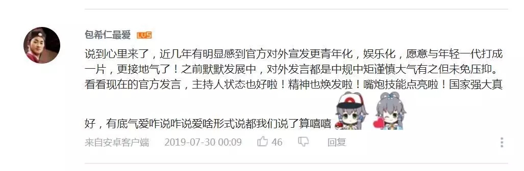 当年轻人熟悉的网络语言和最有价值的信息精妙结合,《新闻联播》一改过去严肃、高冷的姿态,官话民说,硬话软说的效果瞬间拉近了和青年的距离,碎片化、网络化的传播,让《新闻联播》受到了年轻网友的追捧。