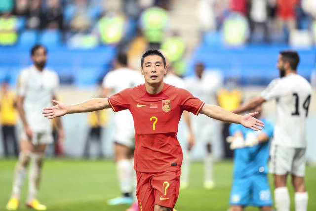 6月20日,中国队球员武磊在比赛中庆祝进球。新华社发