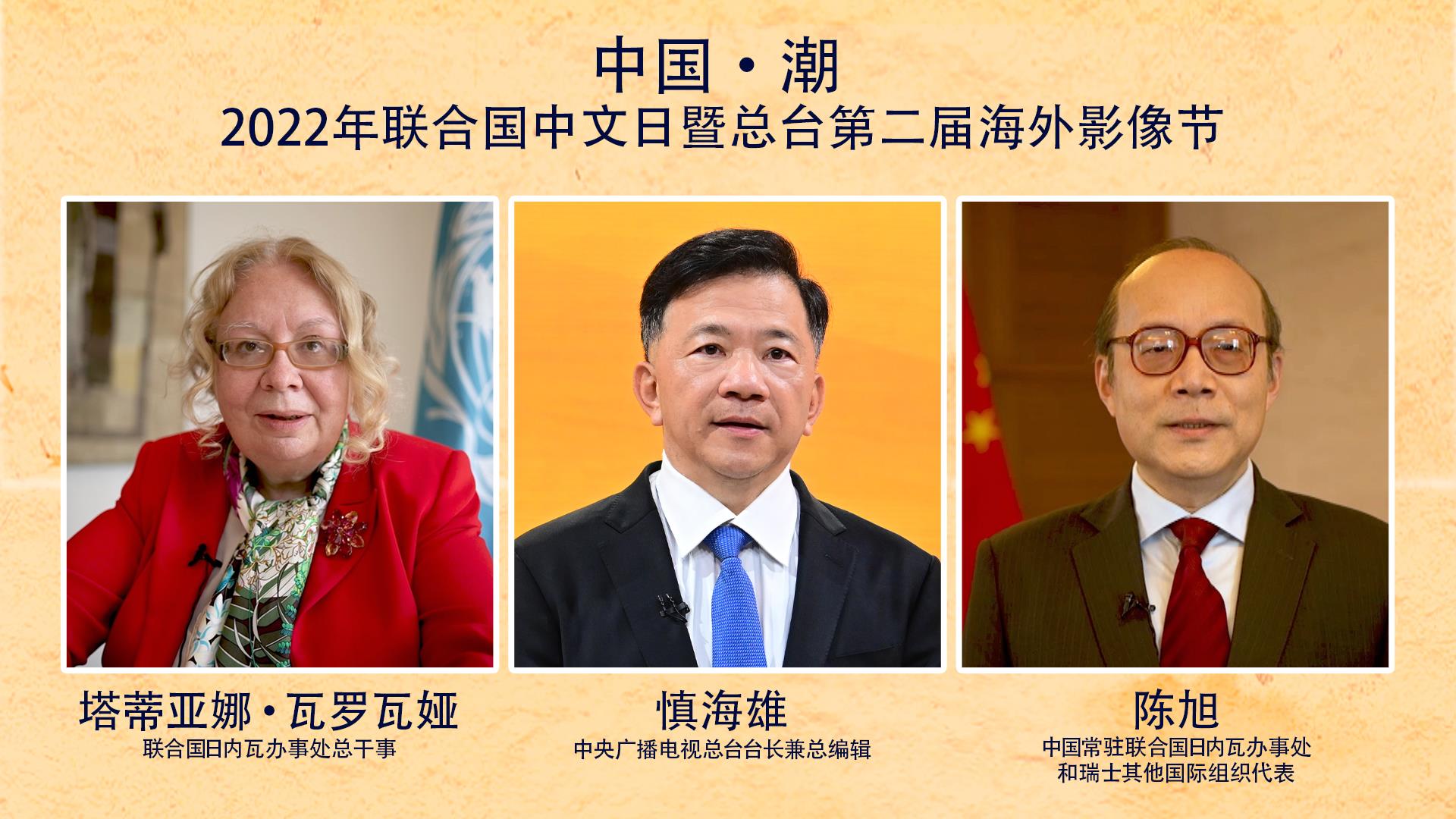 当地时间4月20日,2022年联合国中文日暨中央广播电视总台第二届海外影像节在日内瓦举行。联合国日内瓦办事处总干事塔蒂亚娜·瓦罗瓦娅、中国中央广播电视总台台长兼总编辑慎海雄、中国常驻联合国日内瓦办事处和瑞士其他国际组织代表陈旭大使出席线上活动并致辞。