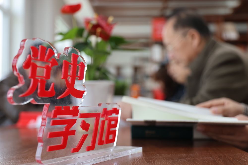 2021年3月16日,人们在河北黄骅市骅中街道信誉楼社区党史学习馆学习党史。