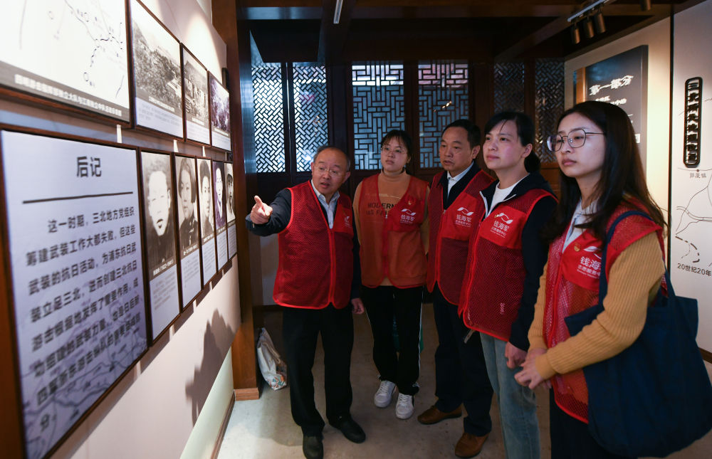 2021年4月23日,浙江慈溪市钱海军志愿服务中心党支部的党员在浙东抗日根据地旧址参观学习。