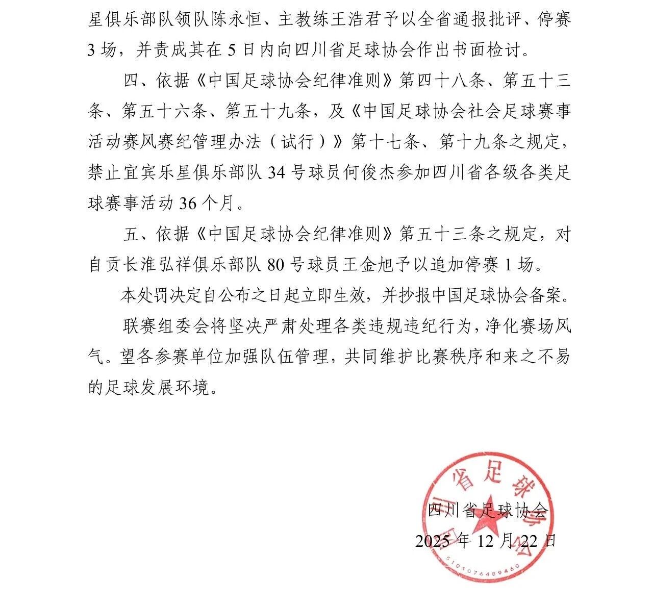 12月21日,在2025年四川“三大球”联赛(足球项目)暨“巴蜀雄起杯”四川省业余足球联赛宜宾乐星俱乐部队(简称“宜宾队”)与自贡长淮弘祥俱乐部队(简称“自贡队”)的比赛中,宜宾队球员何俊杰对自贡队球员苏嘉华进行故意报复,掌掴苏嘉华头部,引发双方冲突。12月22日,四川省足球协会发布官方通告,对涉事双方作出处罚决定。