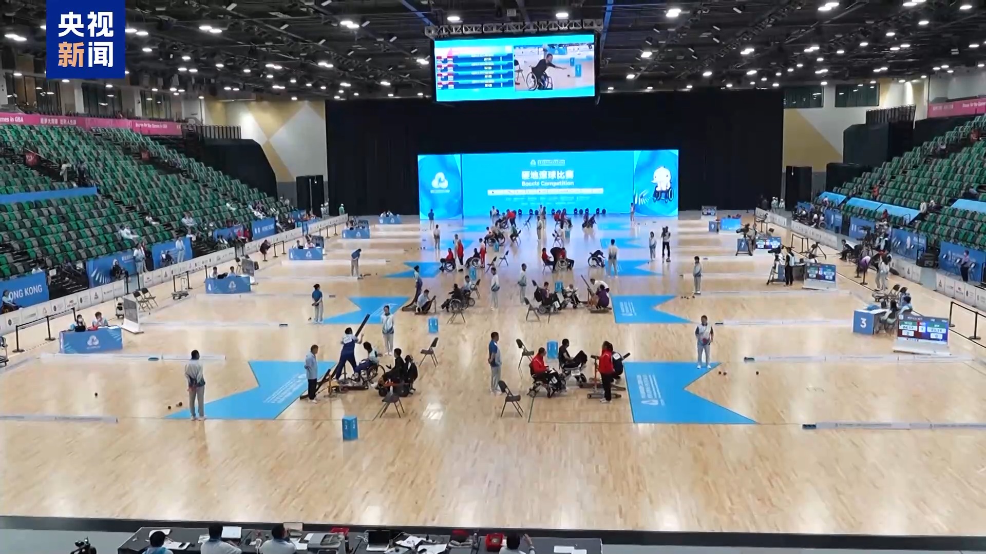总台记者 马媛:这里是香港启德体艺馆,我们现在所在的场地接下来要进行硬地滚球比赛。在赛场内,我们注意到,一些小细节设计是专门为运动员们量身定制的。比如这个场地的木地板就是专门为硬地滚球所搭建的。之前这个边缘有一个小小的台阶,但是现在我们注意到加增了一个斜坡,这也使得运动员们的轮椅可以无障碍地自由平稳安全地通行。除了赛场内为运动员比赛做了精心的准备,赛场外的公共区域也处处都有贴心的设计。