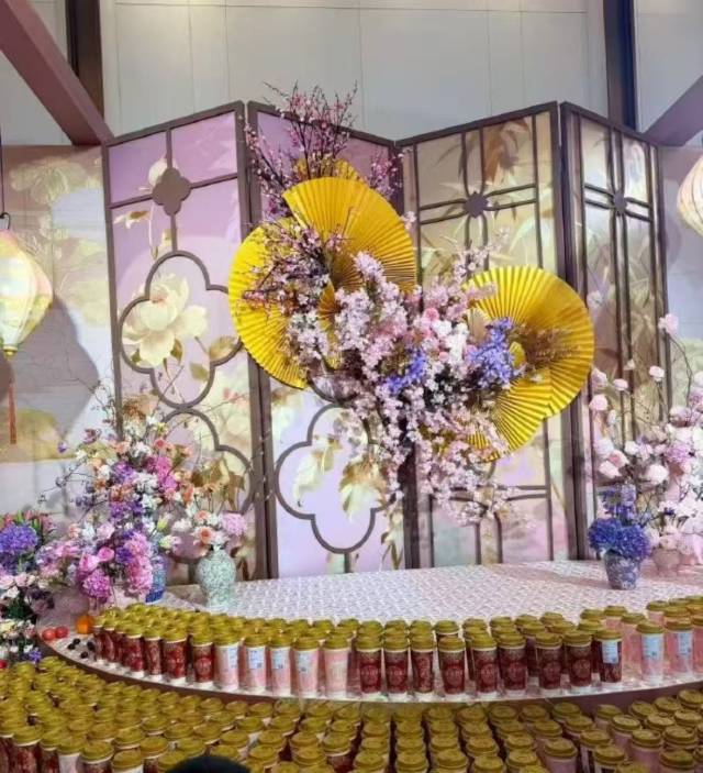 现场照片显示,二人身穿中式礼服,婚宴现场布置有大量霸王茶姬品牌元素,宾客人手一杯品牌奶茶,包括其爆款单品“伯牙绝弦”等。