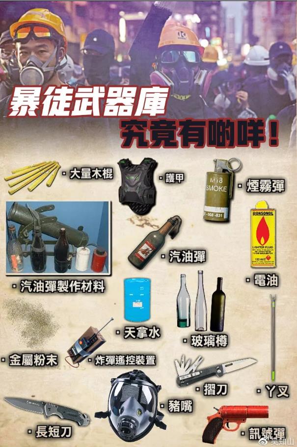 看看暴徒的“武器谱”。汽油弹、通渠水水枪(腐蚀性武器)、简易炸弹、弓箭、改装弹弓、自制烟雾弹、自制火焰发射器、砖头棍棒……化学燃爆、腐蚀性武器和纯物理攻击,不一而足。