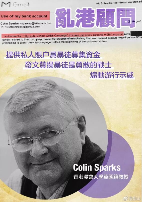 据内部人士透露,柯林·斯巴克斯(Colin Sparks),这位香港浸会大学的英国籍教授看似是一位研究文化传播的学者,其实干了不少乱港的勾当:提供私人账户,为暴徒募集大量资金;发表赞扬暴徒的文章;在一个具有英国官方背景的“网络起义平台”煽动激进游行示威。