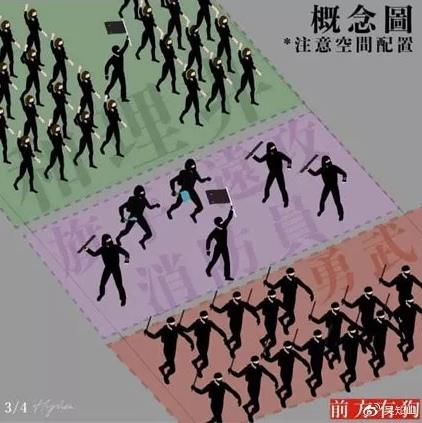 人员如何分工?除了“勇武”与“和理非”外,现场还有“远攻”负责远程物理攻击,“消防员”负责在勇武后方空间灭火。“旗手”是活动现场最重要的现场指挥者,主要职责是信息的传递,保持队形,留意各方面传递来的情报。