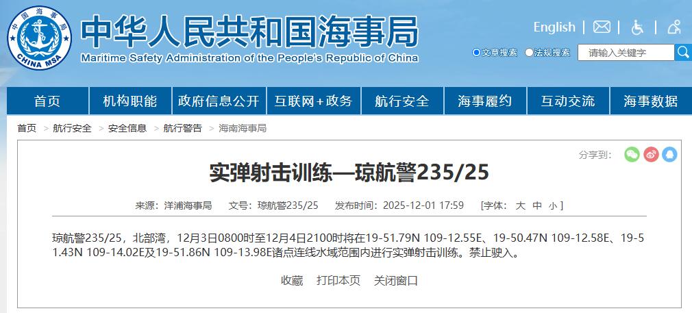 据中国海事局网站消息,洋浦海事局发布航行警告,12月3日8时至12月4日21时,北部湾部分水域进行实弹射击训练。禁止驶入。