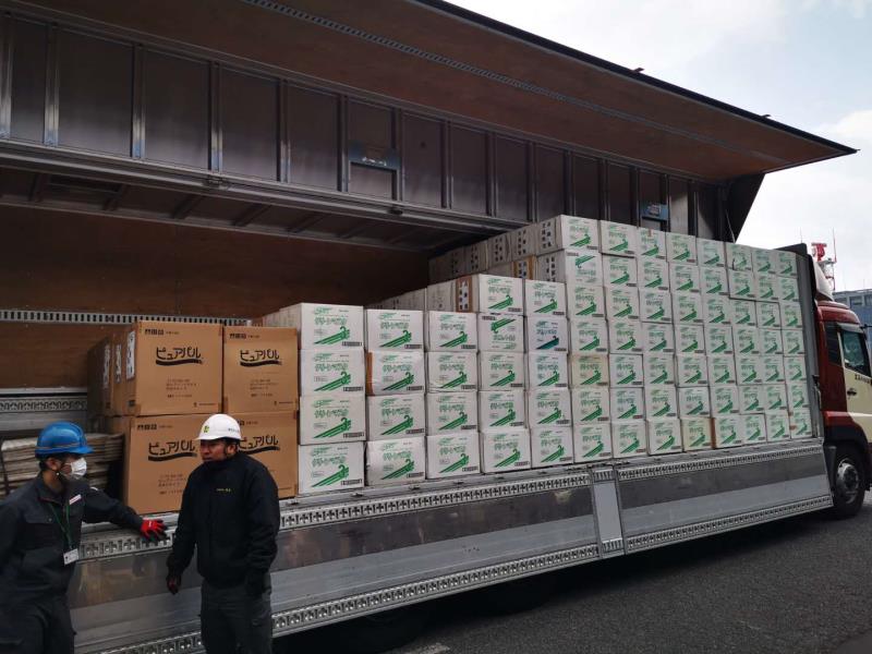 兵库县向广东省捐赠的防灾贮备口罩在日本当地装车。图片由广东省政府外事办提供