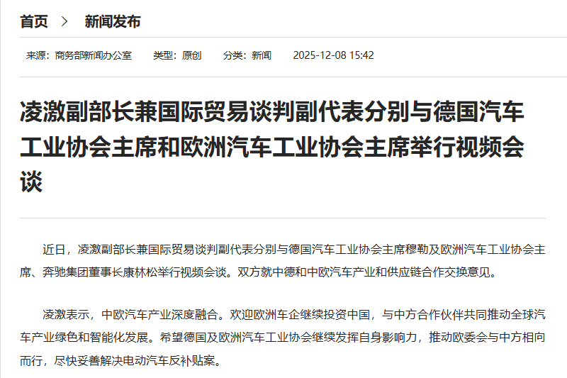 原标题:凌激副部长兼国际贸易谈判副代表分别与德国汽车工业协会主席和欧洲汽车工业协会主席举行视频会谈