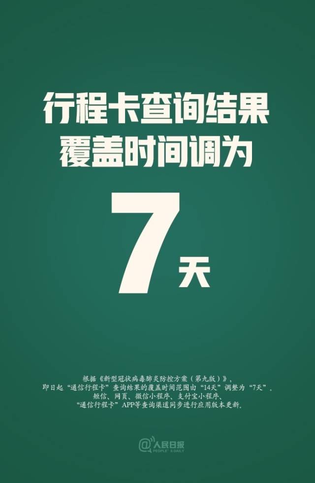 工信部发布公告:根据《新型冠状病毒肺炎防控方案(第九版)》,即日起“通信行程卡”查询结果的覆盖时间范围由“14天”调整为“7天”。短信、网页、微信小程序、支付宝小程序、“通信行程卡”APP等查询渠道同步进行应用版本更新。