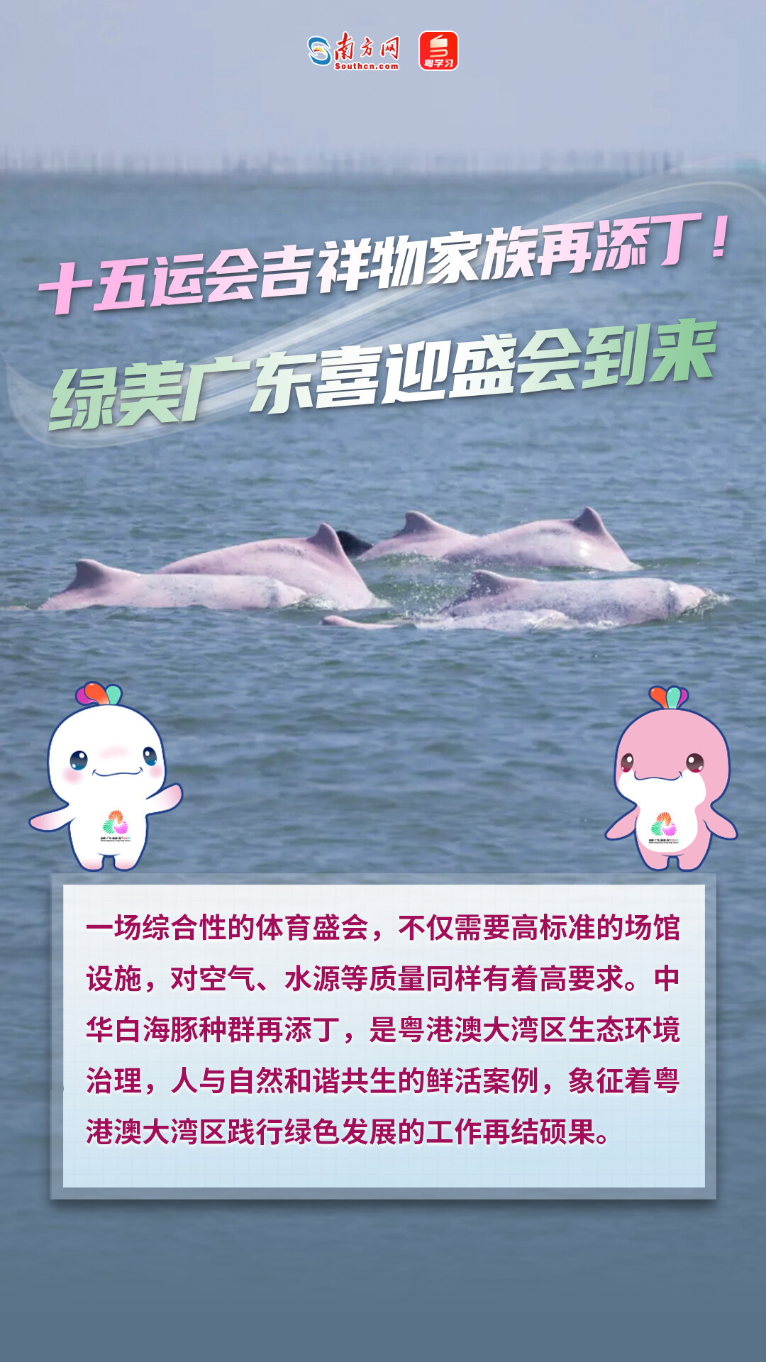 作为我国一级保护动物,同时也是十五运会吉祥物的设计原型,中华白海豚因为数量稀少,并且对栖息环境要求高,一直被视为“海上大熊猫”。中华白海豚种群再添丁,是粤港澳大湾区生态环境治理,人与自然和谐共生的鲜活案例,象征着粤港澳大湾区践行绿色发展的工作再结硕果。