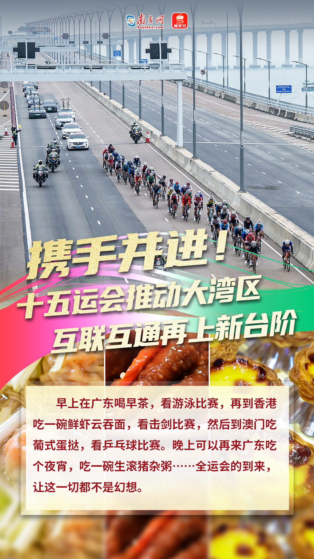 舞台已搭好,赛事已就绪。年底进行的十五运会和残特奥会不仅是“十四五”体育强国建设成果的生动展示,对于大湾区群众来说也是一次“丝滑”来往三地看比赛、品美食,体验互联互通、深度融合的绝佳契机。早上在广东喝早茶,看游泳比赛,再到香港吃一碗鲜虾云吞面,看击剑比赛,然后到澳门吃葡式蛋挞,看乒乓球比赛。如果还不过瘾的话,晚上可以再来广东吃个夜宵,吃一碗生滚猪杂粥……全运会的到来,让这一切都不是幻想。