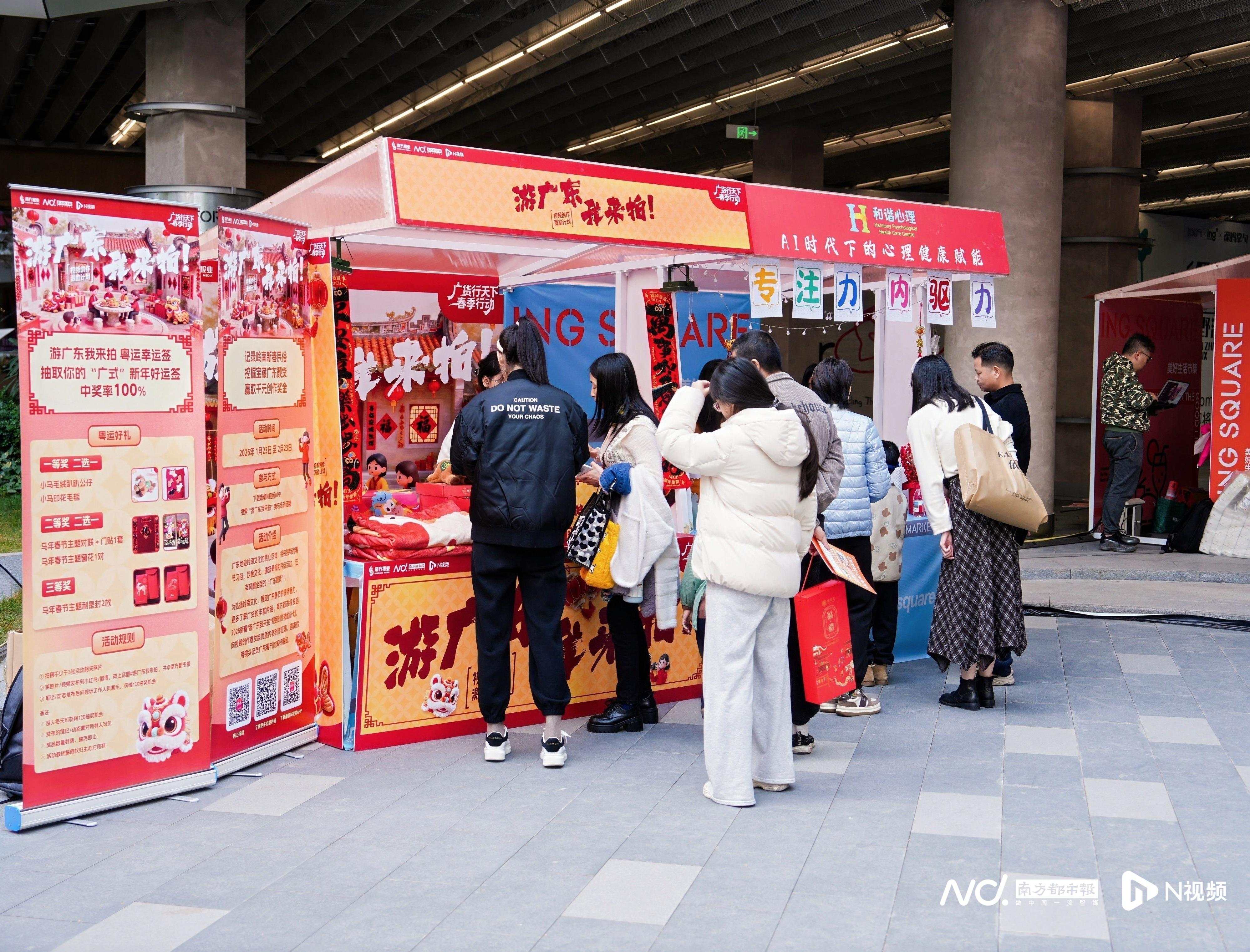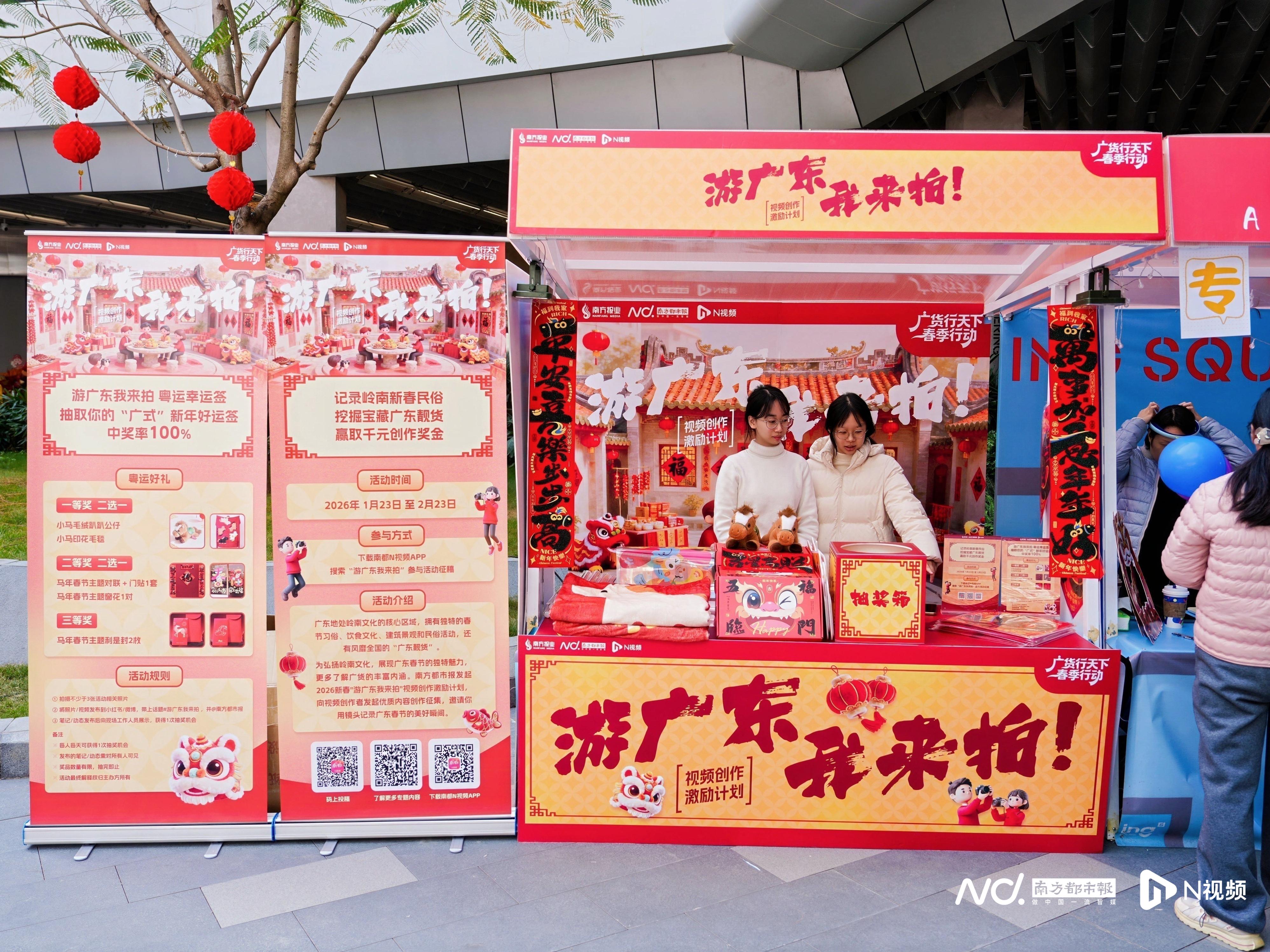 1月24日至25日,活动团队在广州天河区新春科创市集精心布置摊位,将“用镜头记录广东之美,用影像传递湾区温度”的理念融入每个细节。活动现场设置主题打卡区,市民只需在抖音、快手、小红书、微博等平台@南方都市报并带话题#游广东我来拍#参与互动,即可赢取年货好礼。这种“线下体验+线上传播”的创新模式,成功将“游广东”从话题标签转化为真实体验。