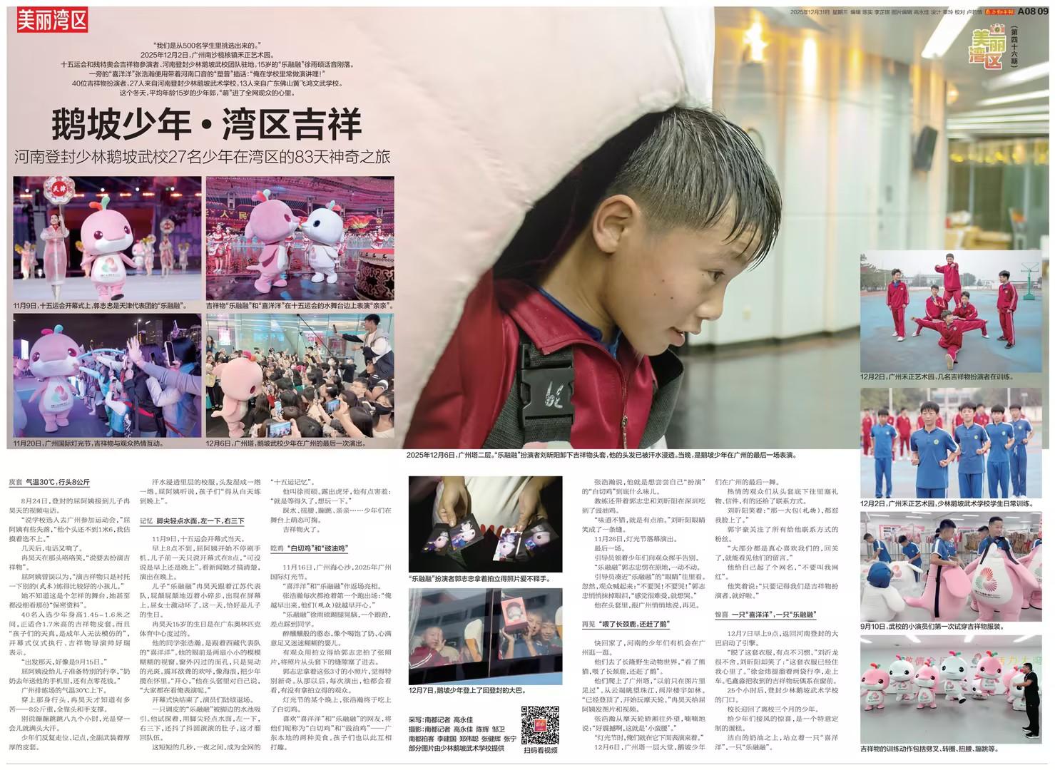 在为期一个月的深度报道里,将视角从台前可爱的“萌感”,延伸至幕后训练的汗水与内心的真实情感。当扮演者表达“脱了这套衣服,有点不适应”“这套衣服已经住我心里了”等独白时,这些细节让观众看到,火爆全网的不仅是吉祥物的外形,还有鹅坡武校少年们特有的坚韧,以及对大湾区这片舞台的深切留恋。