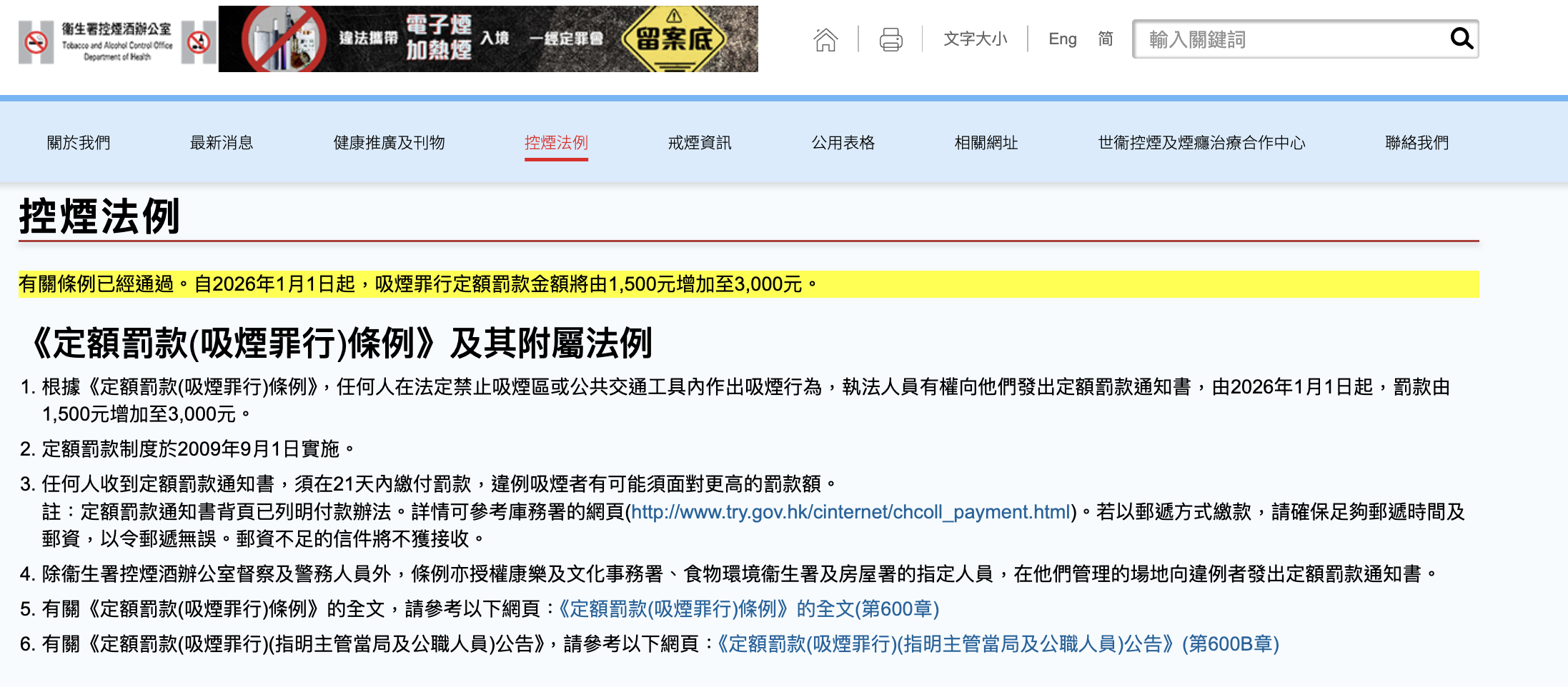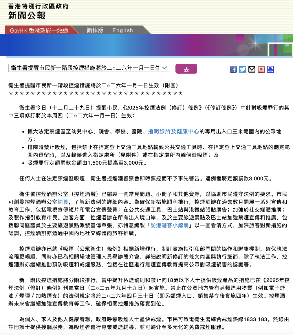 另据香港卫生署控烟酒办公室网站,根据《定额罚款(吸烟罪行)条例》,任何人在法定禁止吸烟区或公共交通工具内作出吸烟行为,执法人员有权向他们发出定额罚款通知书,由2026年1月1日起,罚款由1500港元增加至3000港元。