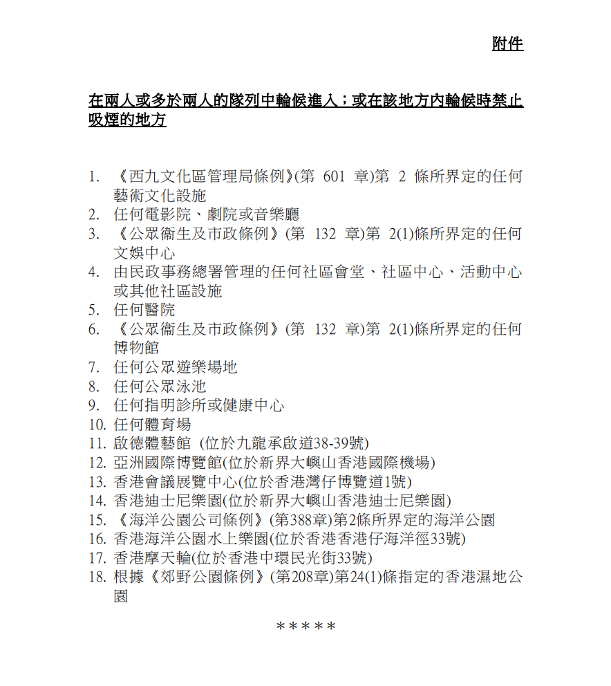 排队时禁止吸烟,包括禁止在指定登上交通工具地点轮候公共交通工具时、在指定登上交通工具地点的划定范围内逗留时,以及轮候进入指定处所(见附件)或在指定处所内轮候时吸烟;