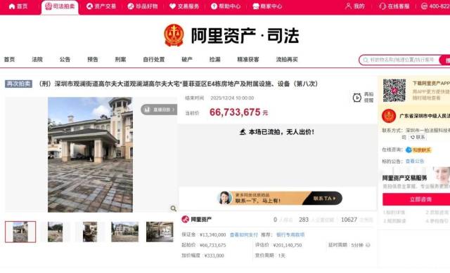 近日,一套位于深圳市观澜街道高尔夫大道观澜湖的高尔夫大宅及附属设施、设备等以6673.37万元起拍,但无人报名,最终流拍,这已经是该标的第8次流拍。