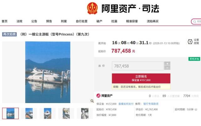 另一项涉案资产公主游艇的处置则仍在推进中。该游艇将于2026年1月13日迎来第九次拍卖,起拍价已从最初的263.72万元大幅降至78.75万元,折价幅度超70%。