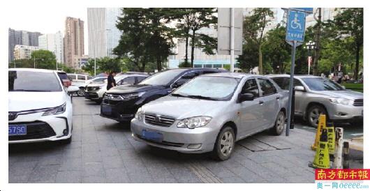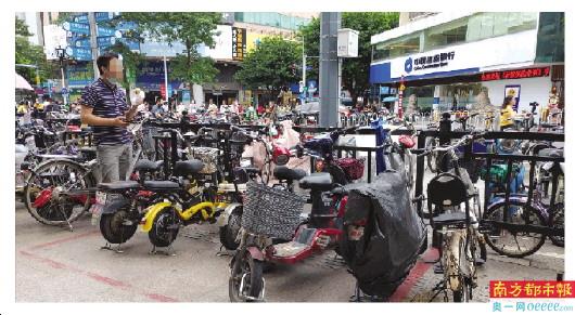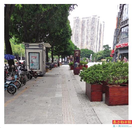 9月24日,南都记者来到大沙地地铁站C出口,发现C出口下坡处盲道已磨损严重,走上去触感不强。由于C出口就是购物中心,大量共享单车和电瓶车就停放在出口外的人行道上,并且严重占用了盲道,盲道被占用路段长约250米。在购物中心出口处,地面有画线安排车辆停放,但画线无视了盲道的存在,直接将盲道划为停车区。