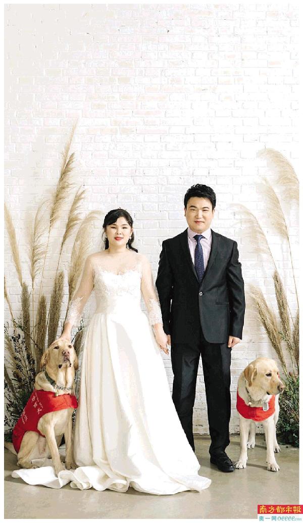 王志华(左)和周彤的婚纱照,两只导盲犬是他们的“孩子”。 受访者供图