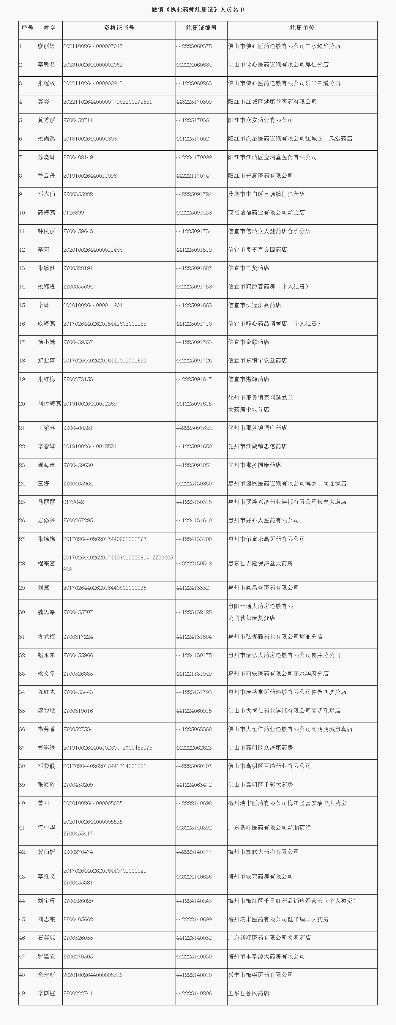根据近期全省各级药品监管部门对药品经营企业的监督检查结果,廖丽婷等49名执业药师注册单位与实际工作单位不一致,现依据《执业药师注册管理办法》(国药监人〔2021〕36号)规定,广东省药品监督管理局决定撤销廖丽婷等49人的《执业药师注册证》,三年内不予注册,并将其个人不良信息记入全国执业药师注册管理信息系统。