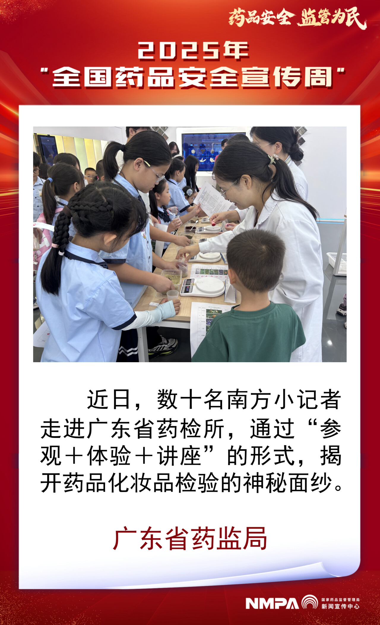 此次活动作为广东省2025年“全国药品安全宣传周”的重点活动之一,由广东省药品监督管理局指导,广东省药检所主办,通过“参观+体验+讲座”的形式,在孩子们心中播下安全用药用妆的种子。