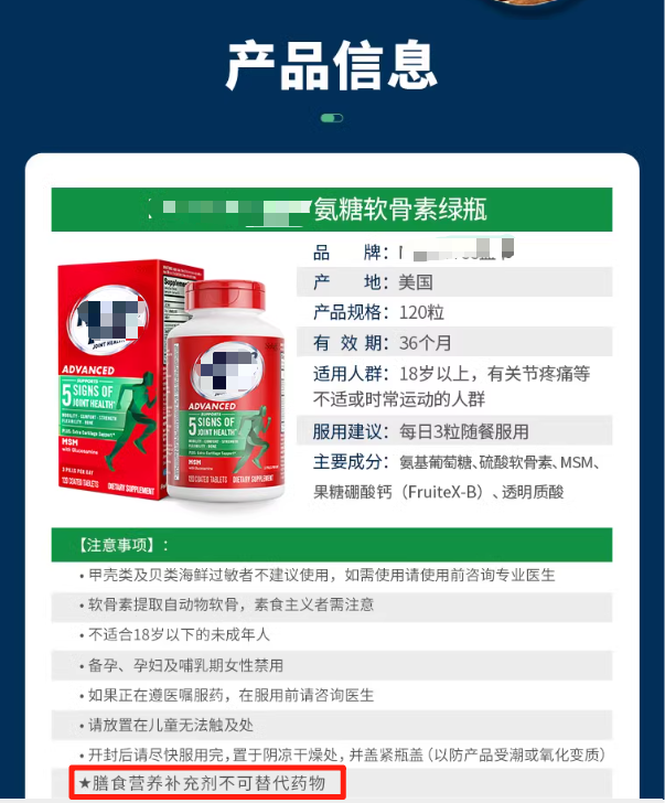 然而,这种看似“包治”各种关节问题的氨糖产品,实际上只是一种膳食营养补充剂。产品信息的注意事项中也明确标识是膳食营养补充剂,不可替代药品。所谓的“OTC行列”纯属主播概念混淆的误导。