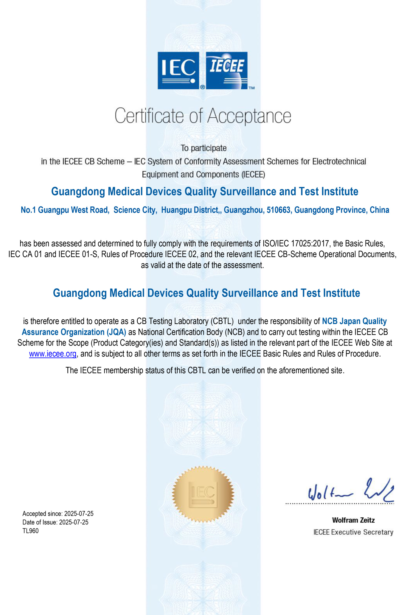 近日,广东省医疗器械质量监督检验所成功取得国际电工委员会电工产品及零部件测试证书互认体系(IECEE CB体系)检测实验室资质证书,资质涵盖电磁兼容和医用电气设备领域12项IEC标准。这标志着广东省医疗器械质量监督检验所质量管理体系和相关检验能力获得国际认可,成为国内首个获得CB检测实验室资质的省级医疗器械检验机构,将为本地医疗器械企业产品出口提供相应检测服务。