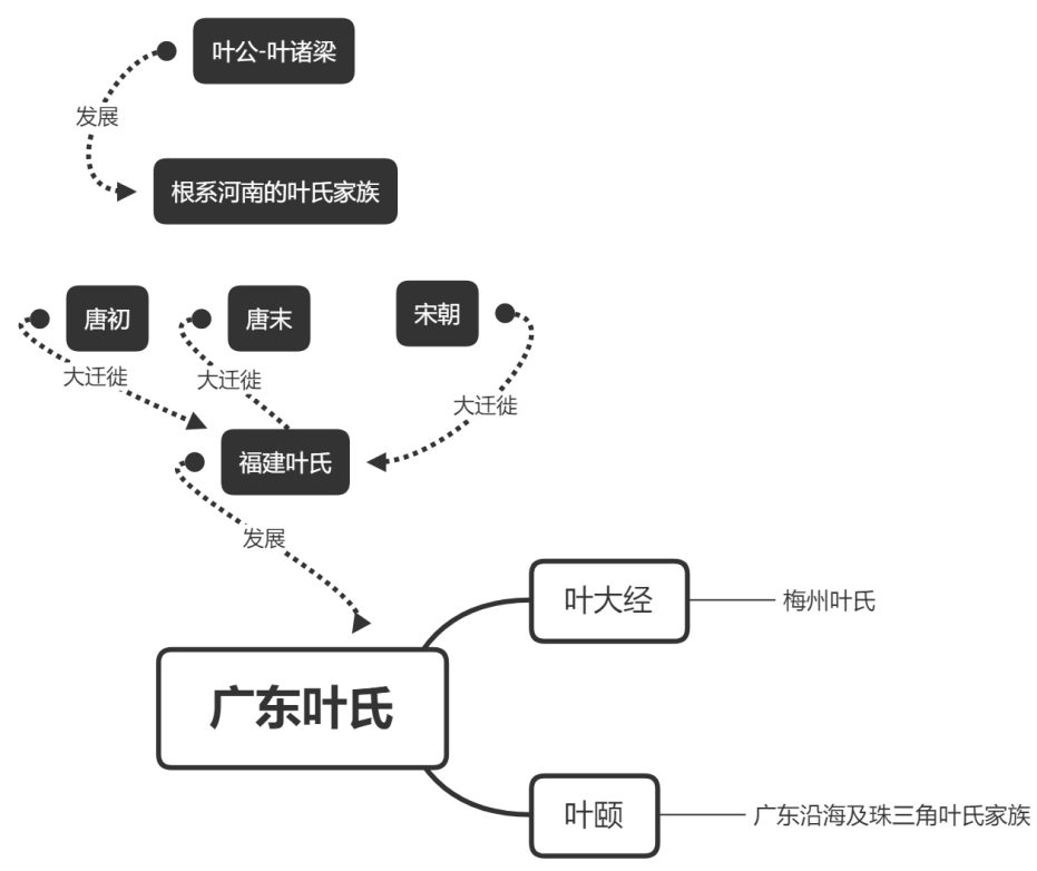 广东叶氏,其有两条分支,一是梅州叶氏,二是由福建叶氏发展而来广东叶氏。宋朝宰相叶颐居南海大圃,后期家族在广东南海发展壮大至广东沿海和珠三角一带,广州、东莞的叶氏家族同样都是追溯于此。