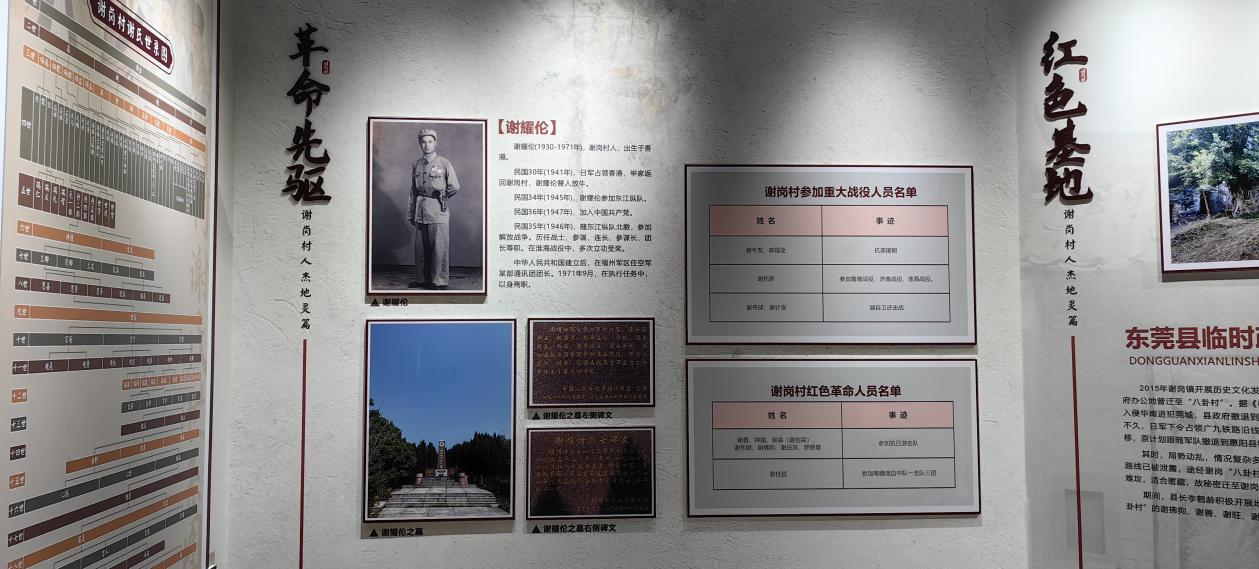 谢耀伦(1930-1971),谢岗村人,出生于香港。1941年日军占领香港,谢全家返回谢岗村。1945年5月谢耀伦参加东江纵队,1947年加入中国共产党。1946年随东江纵队北撤,参加解放战争。历任战士、参谋、连长、参谋长、团长等职。在淮海战役中,多次立功受奖。中华人民共和国建立后,在福州军区任空军某部通讯团团长。1971年9月,在执行任务中,以身殉职。
