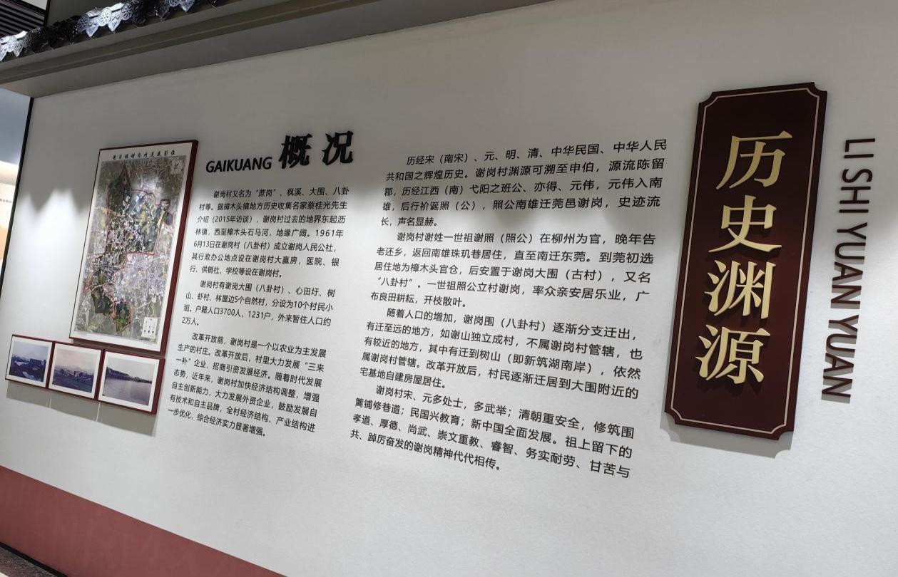 谢岗村渊源可溯至申伯,源流陈留郡,历经江西(南)弋阳之班公、亦得、元伟,元伟入南雄,后行衸诞照(公),照公南雄迁莞邑谢岗,史迹流长,声名显赫。谢岗村谢姓一世祖谢照(照公)在柳州为官,晚年告老还乡,返回南雄珠玑巷居住,直至南迁东莞。到莞初选居住地为樟木头官仓,后安置于谢岗大围(古村),又名“八卦村”。一世祖照公立村谢岗,率众亲安居乐业,广布良田耕耘,开枝散叶。