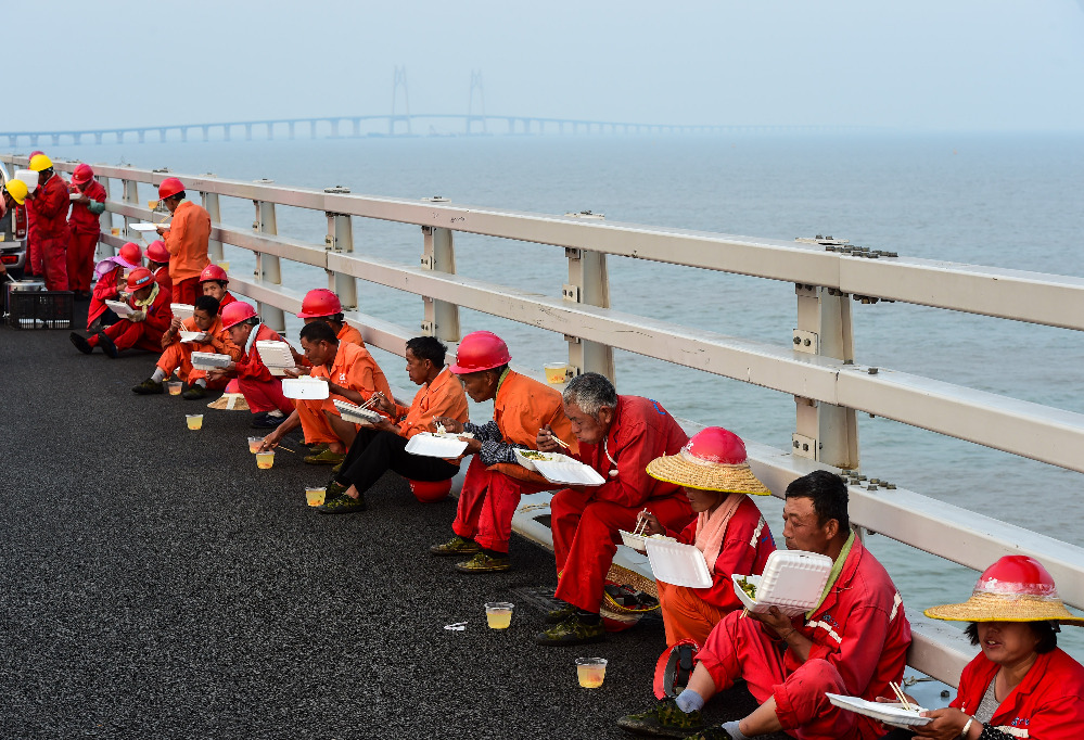 为了抓住大桥建设的天气窗口期,正在港珠澳大桥九洲航道桥面铺设沥青的工人们轮流吃晚饭。