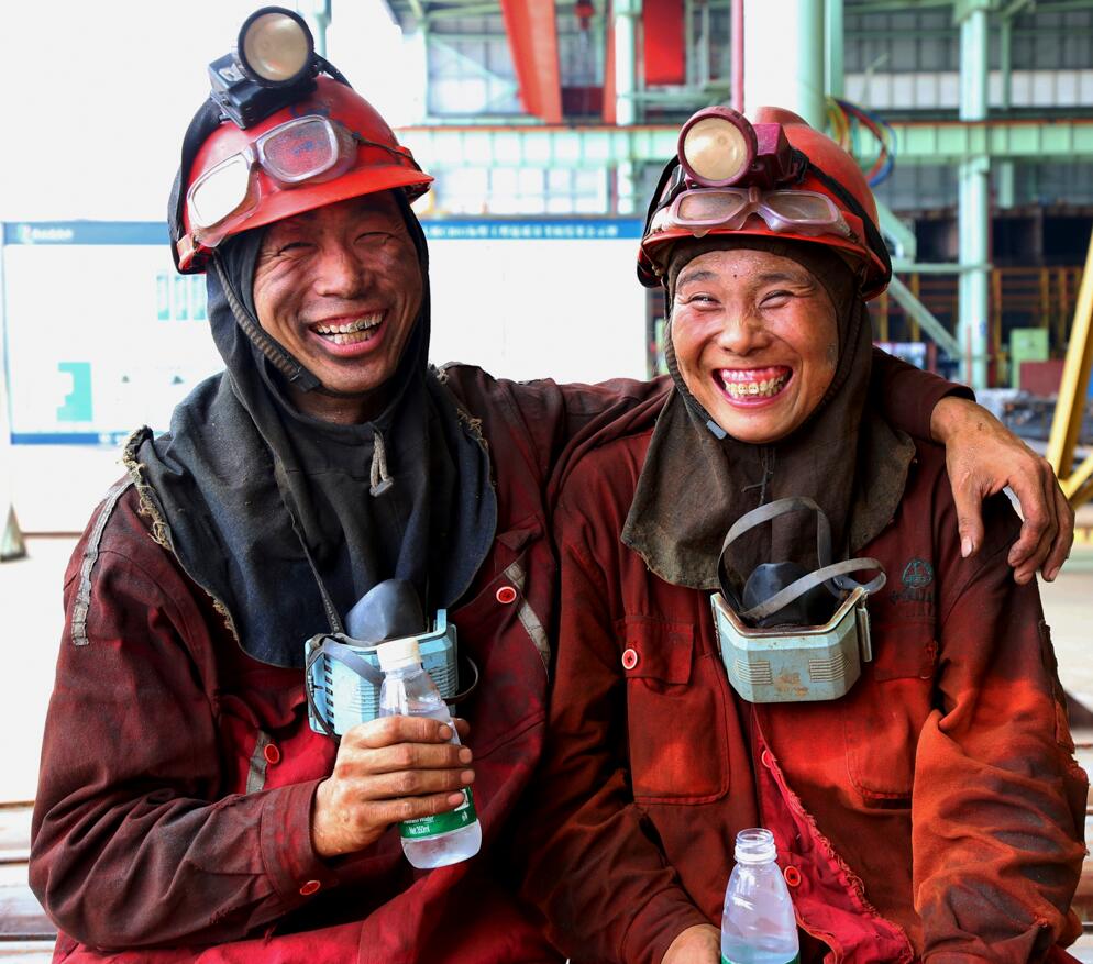 工作人员和妻子一边喝水一边合影,露出灿烂的笑容。