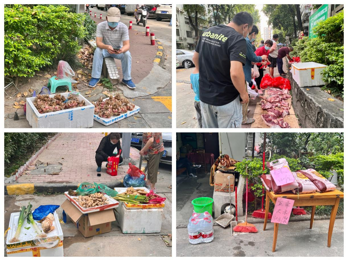 越接近小区门口,人群熙攘声越明显。一路上,猪肉摊位、生菜档、粮油社在路边花坛就地而设,居民们有序购买。猪肉摊位更是自备喷火枪,现场烤起了猪肉,路过闻到阵阵烧肉飘香。我也是第一次见这样的“奇观”,感觉管控下小区内反而增添了烟火气。