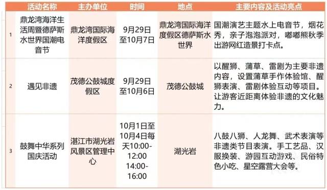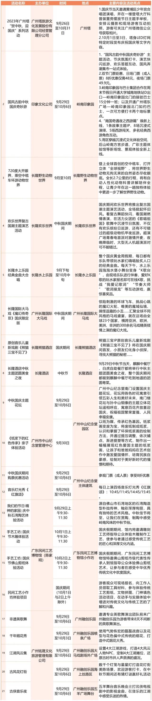 广州岭南印象园推出“国风古韵中秋国庆奇妙游”。9月29日至10月6日,园区内即可体验节庆氛围打卡、演艺快闪巡游、欢乐答题互动、国风弄潮集市一站式活动。长隆欢乐世界同样推出复古国潮主题演艺活动,将掀起怀旧风,既有复古舞蹈快闪、国潮燃情表演,又能在活力女团《歌唱祖国》歌舞中沉浸节日氛围。