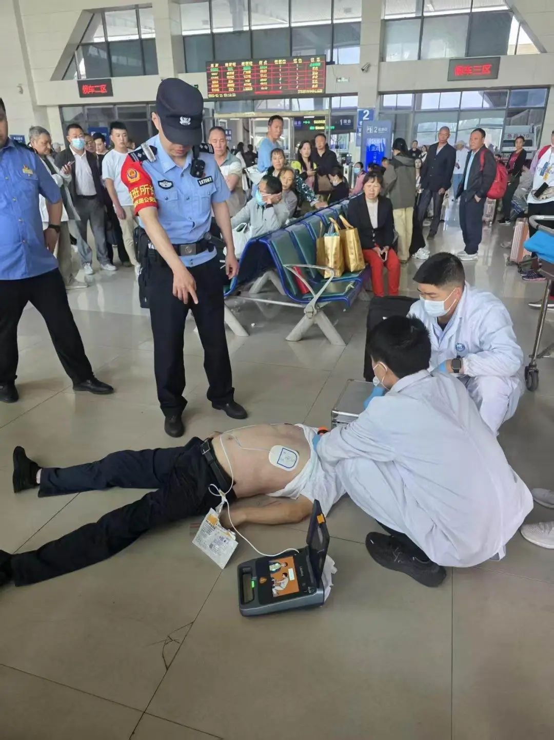 5月11日,湖北麻城北站候车大厅人来人往,一名男乘客发生心脏骤停,倒地不起。一名身着白色上衣、深色裤子的男士正在为其做心肺复苏。此时的男乘客已意识昏迷,情况十分紧急。