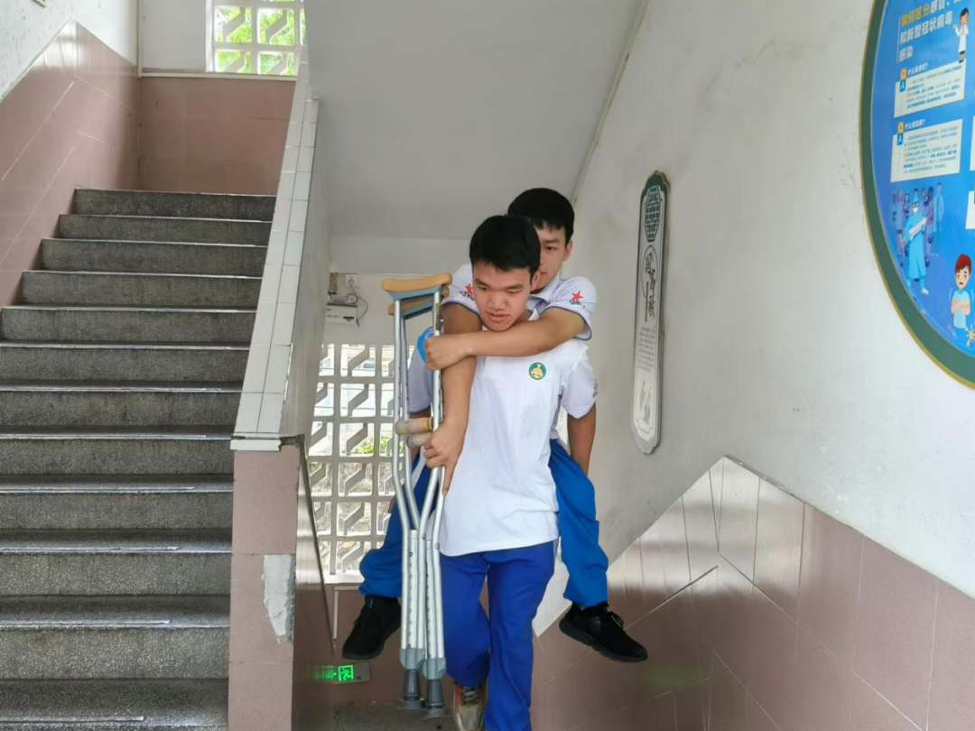 曹楚文背着哥哥爬楼梯进入教室。林良田 摄