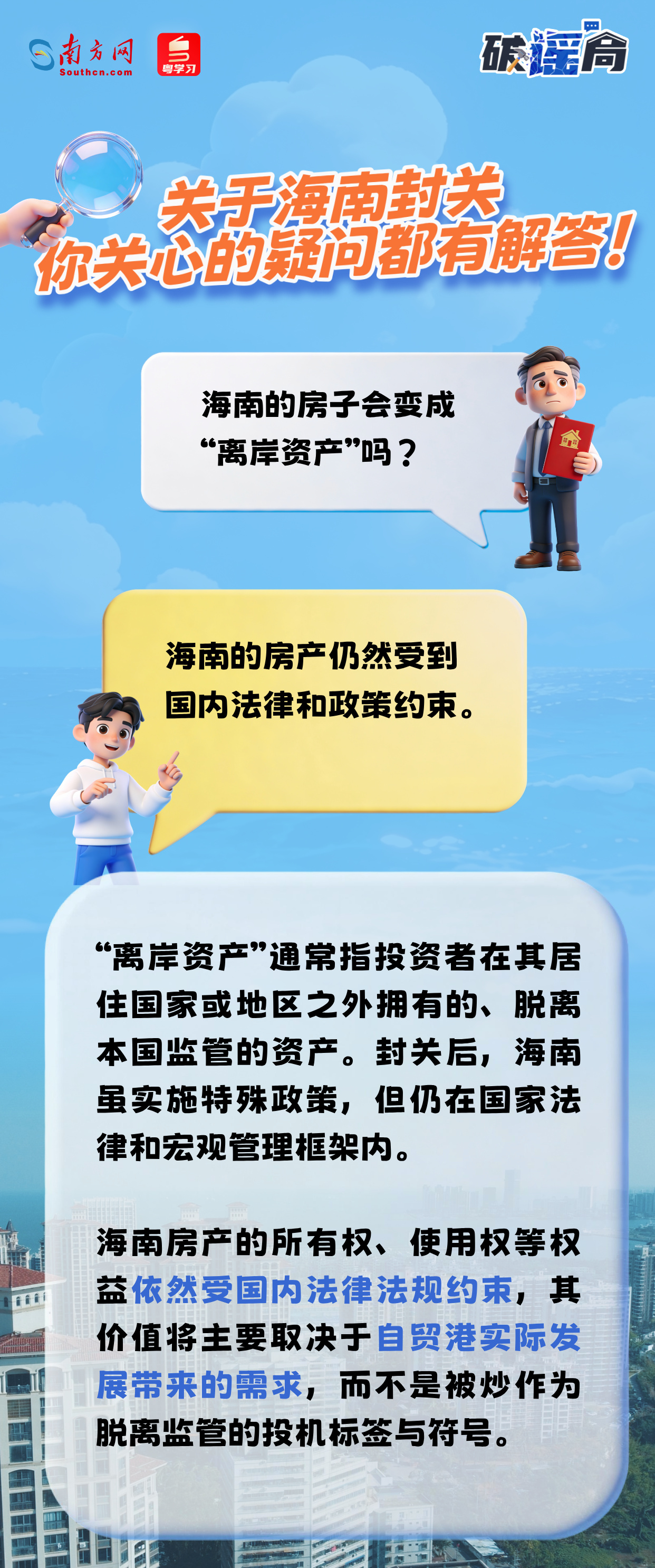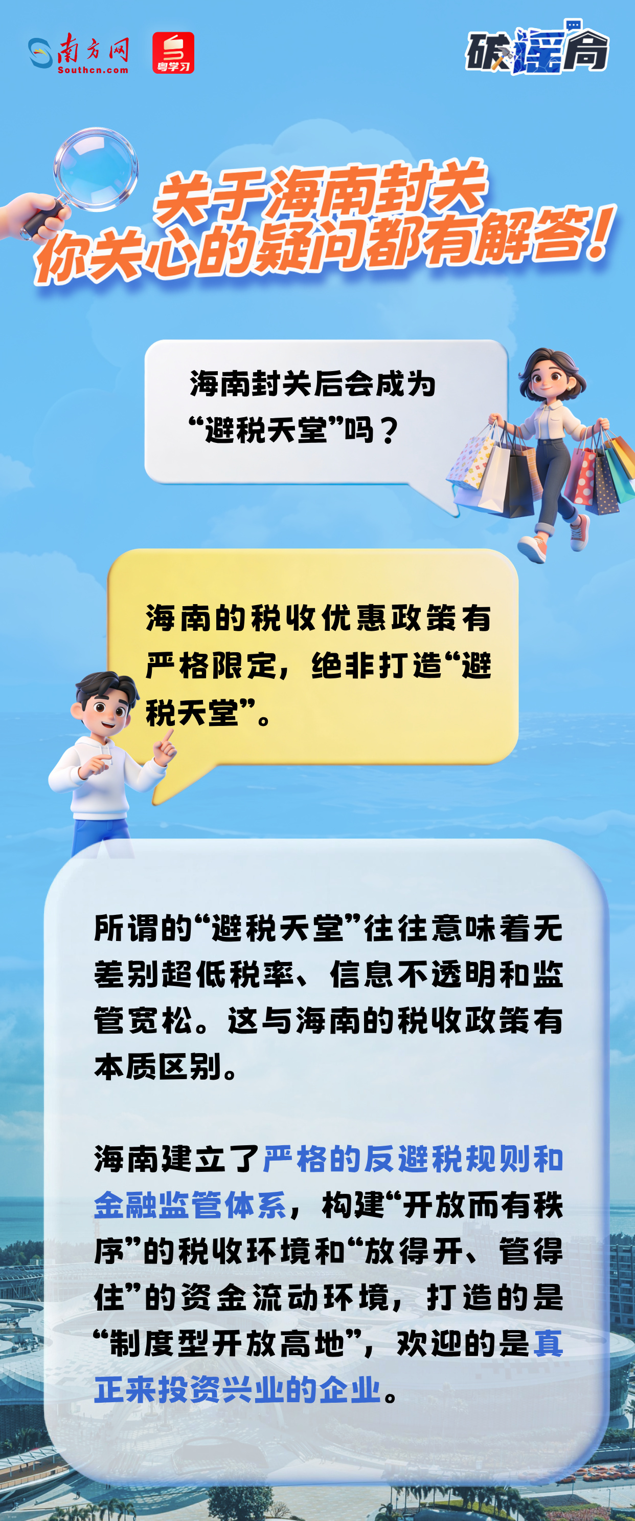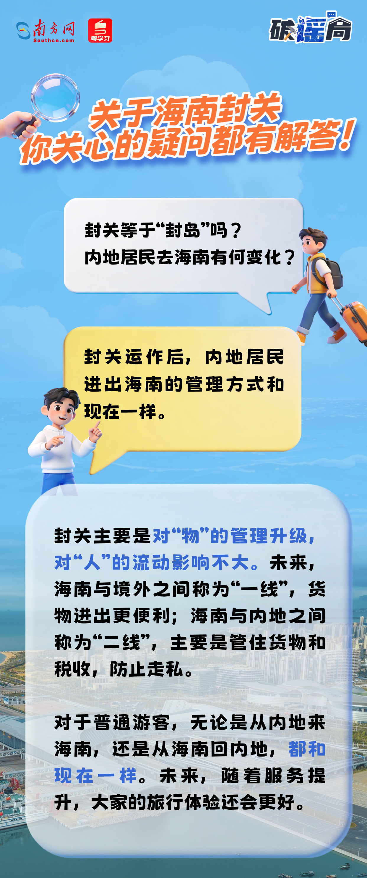 近期,网络上关于海南全岛封关出现了不少错误解读。事实上,海南封关不是“封岛”!内地居民去海南旅游、出差照样方便!“海南成为避税天堂”“房子变成离岸资产”等说法均不靠谱!关于海南封关,你关心的这些疑问都有解答↓