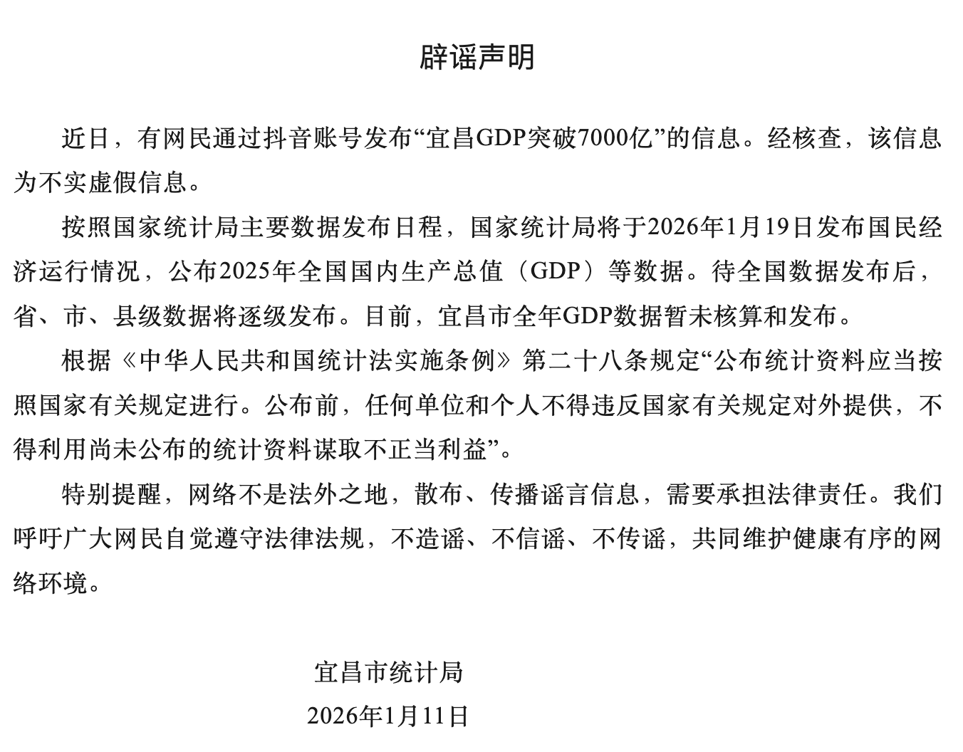 该声明写到,目前,宜昌市全年GDP数据暂未核算和发布。