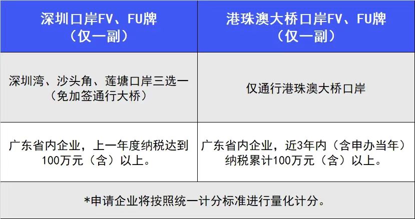 根据“广东交警”微信公众号发布的指引,两地车牌的办理条件因不同口岸和申请主体会有所区别。上一年度纳税达到100万元(含)以上的广东省内企业,可以在深圳湾、沙头角、莲塘口岸中选择一个口岸申请FV或FU牌;近三年内(含申办当年)纳税累计100万元(含)以上的广东省内企业,可在港珠澳大桥口岸申请FV或FU牌。