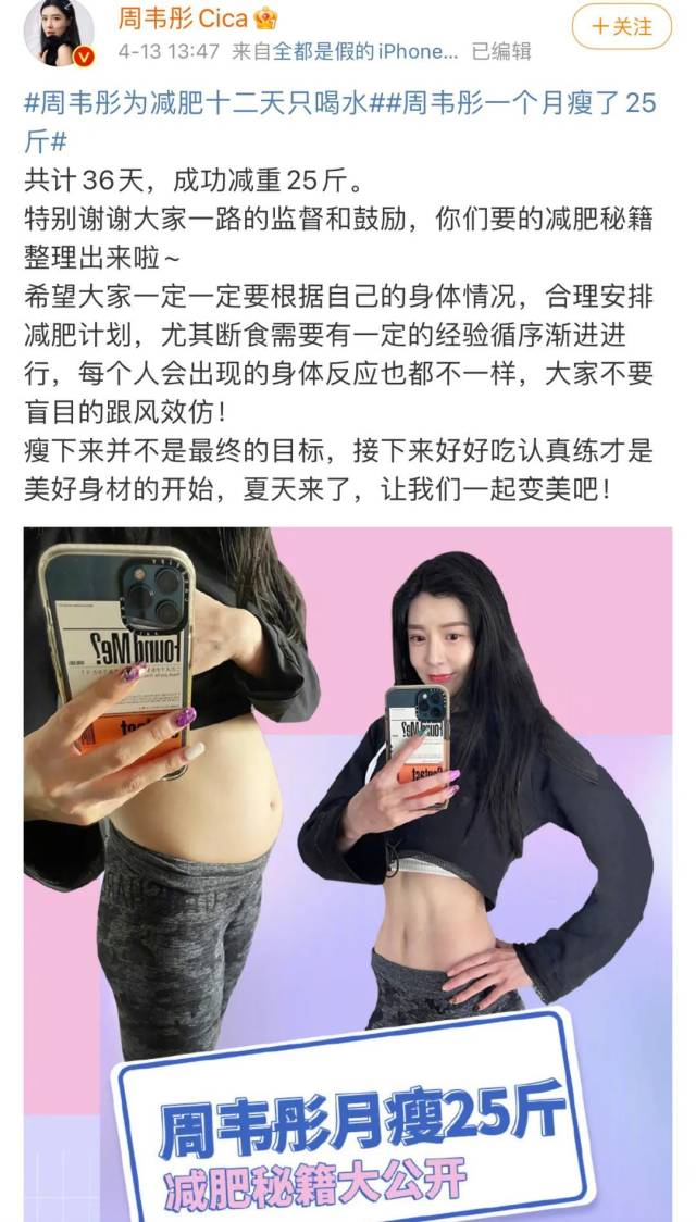近日,女演员周韦彤在社交平台分享了自己的减肥方法。她说自己仅用了36天就成功减掉25斤。随后,连续登上两条热搜。网友疾呼:千万别学>>