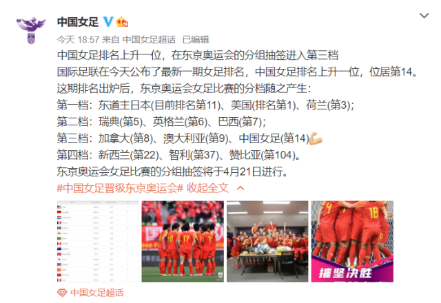 国际足联公布了最新一期女足排名,中国女足排名上升一位,位居第14,在东京奥运会的分组抽签进入第三档。详情