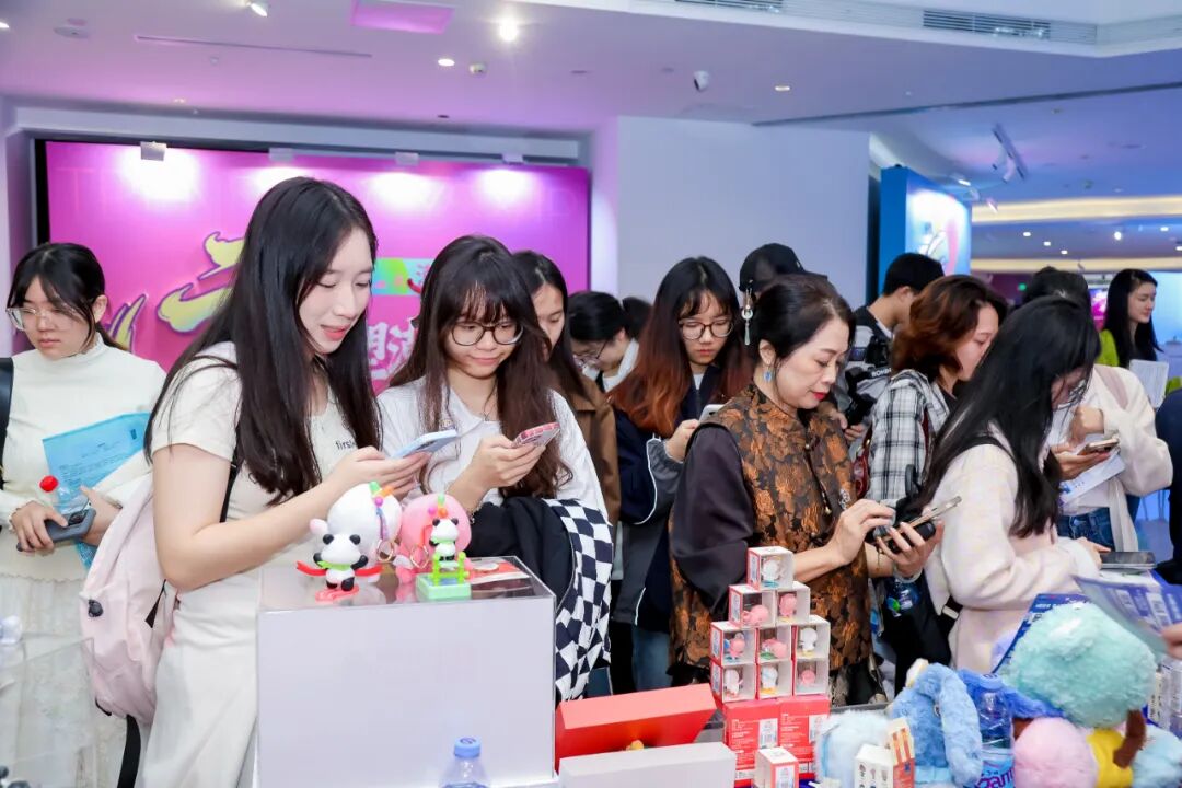 创意市集更是精彩纷呈:文化科技区,体验全感VR世界、感受冰雪幻境的震撼;非遗产业区,技能大师让历史传承焕发时代新彩,“墩头蓝”、雷州仿生菠萝窑陶瓷生动展示非遗的蓬勃活力;电影空间区,以《日掛中天》《落凡尘》《长安的荔枝》等粤产电影海报为媒,铺展广东影视产业的创作长卷;潮玩IP区,聚焦本土潮玩IP孵化,如“鹏小北”、四喜财神等,构建潮流文化消费生态,吸引年轻人“打卡”“种草”;动漫游戏区,三七互娱等企业向青年人才展示“游戏+公益”的创新实践。