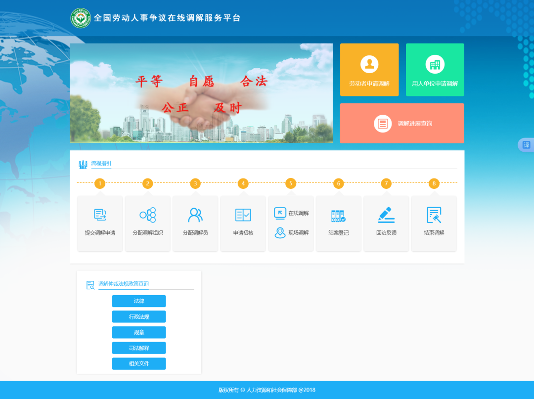 当事人可以直接网上递交申请,也可以输入网址http://tiaojie.12333.gov.cn/portal,进入“互联网+调解”服务平台首页。