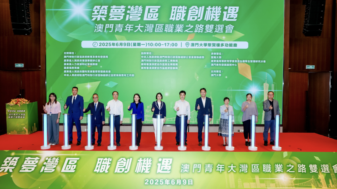 由澳门特区政府教青局、广东省港澳办、广东省人力资源和社会保障厅、广东省教育厅、广东省国资委、澳门中联办教青部联合举办的“澳门青年大湾区职业之路双选会”,于6月5日、6月9日分别在暨南大学、澳门大学顺利举行。澳门特别行政区社会文化司司长柯岚出席澳门专场活动仪式。